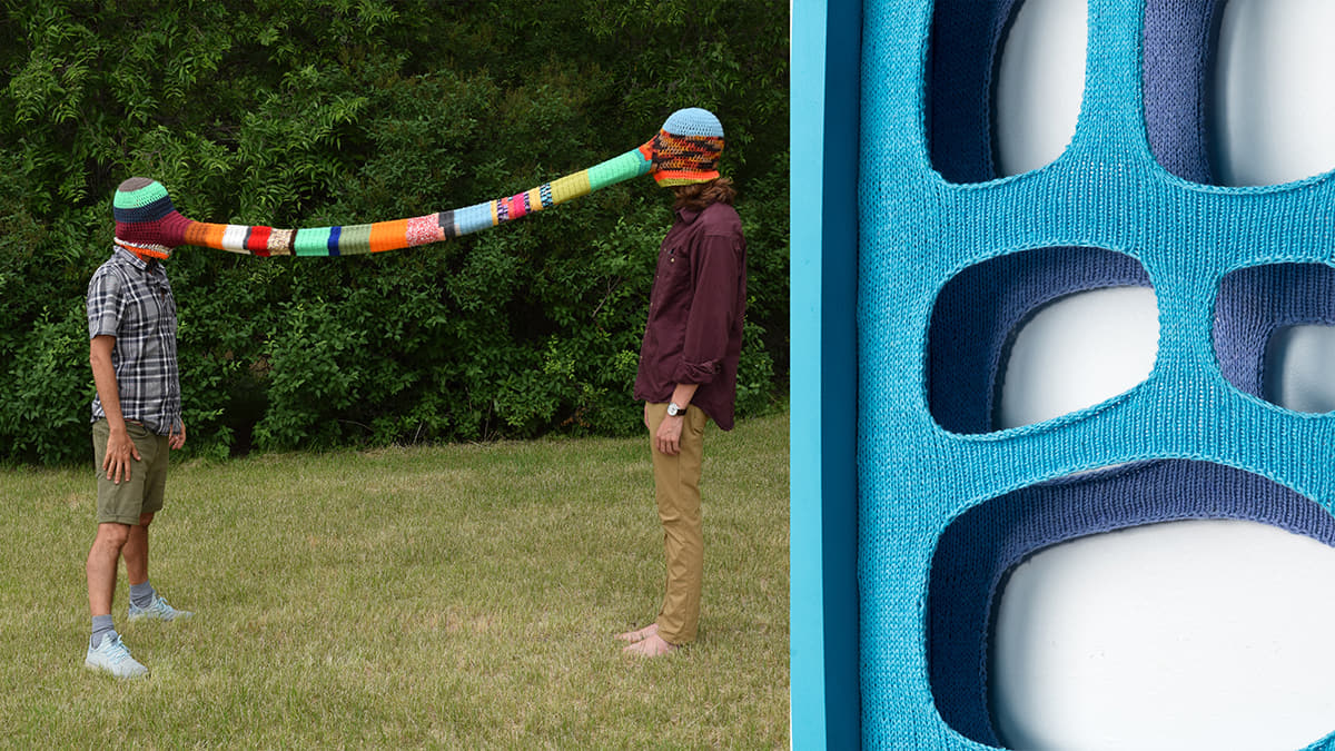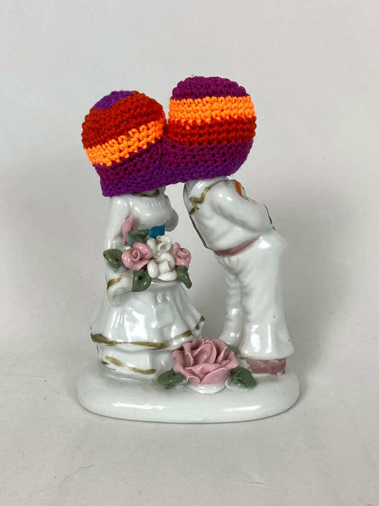 BOX 13 ArtSpace is pleased to present two exhibitions opening September 26, 2020. In the Window BOX, Claire Drennan’s installation Vote Blue Sky connects street and sky through found textiles that provide a message of hope. In the Front and Back BOX, Elaine Bradford’s exhibition, The Distance Between, consists of found photographs altered through embroidery to literally and metaphorically bind people together in a time of longing and uncertainty.