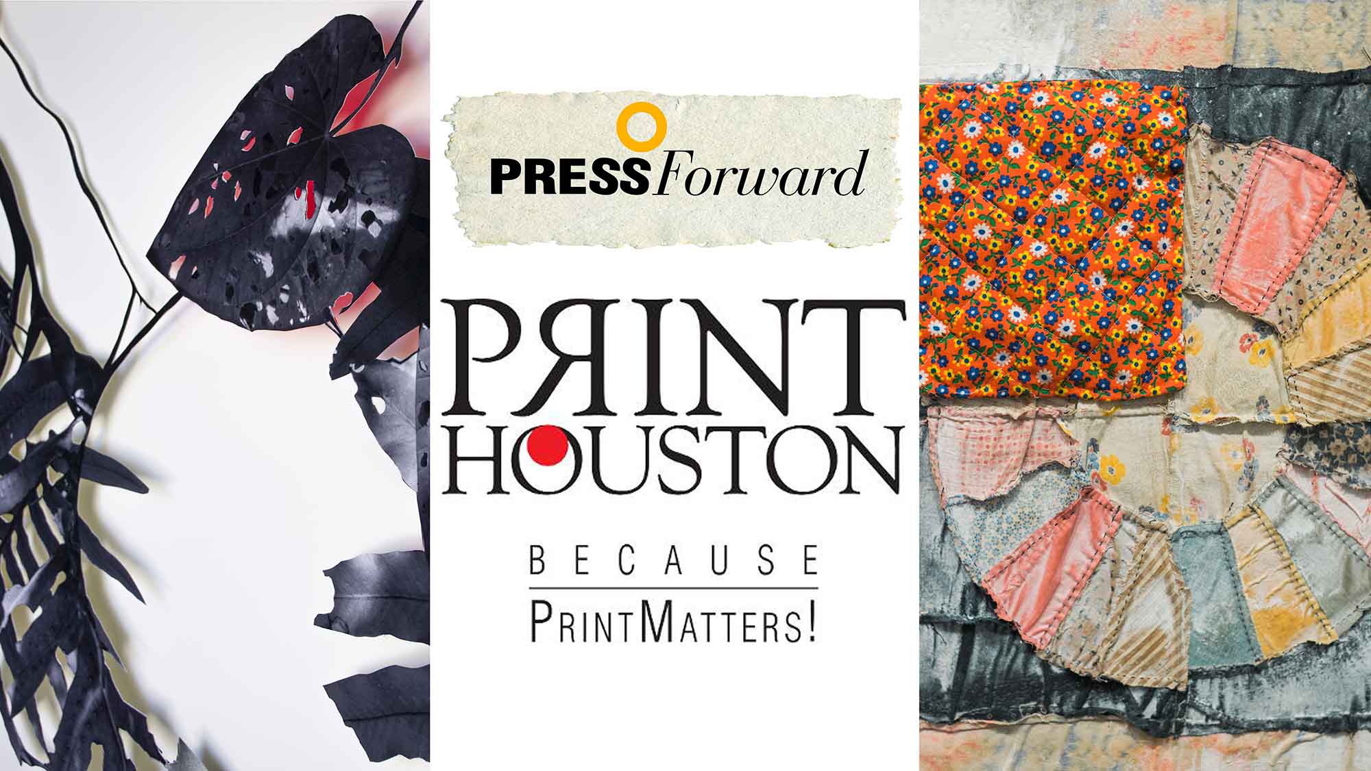In our Front BOX, we have Venessa Monokian’s exhibition entitled “Competitive Nature” that takes on the topic of invasive species but truly with an innovative twist. She cuts, paints and hand manipulates photographs to that allows the images to obtain a strange and mysterious glow that spreads into the space itself. Then in our Back BOX gallery PrintHouston is pleased to announce Press Forward, a national student printmaking juried exhibition. This year’s show is juried by Melanie Yazzie, an artist and Professor of Printmaking at UC Boulder, will be our juror for this exhibition. Finally moving to our Window BOX, Dana Caldera creates a exhibition entitled “Material World” is a site specific art installation created for the Window Box Gallery. The oversized collage artwork completely fills the wall of the gallery, like a hanging quilt, wallpaper, or indoor mural. The resulting piece is highly tactile and visually complex. “Material World” is funded in part by the City of Houston through Houston Arts Alliance.