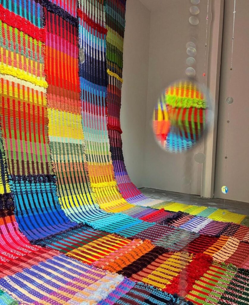 “Originally crafted in 2021 under the title Cognitive Vibrations, this work was inspired by CBT (Cognitive Behavioral Therapy). In CBT, a color board was used as an exercise for anxiety. The installation “Cognitive Vibrations” is a direct response to incomplete therapy, utilizing the creation of intricate weavings. This body of work has since evolved into dynamic site-based installations. Each installation is a reflection of my ever-changing perspective and state of being, adapting to the unique essence of each location.
