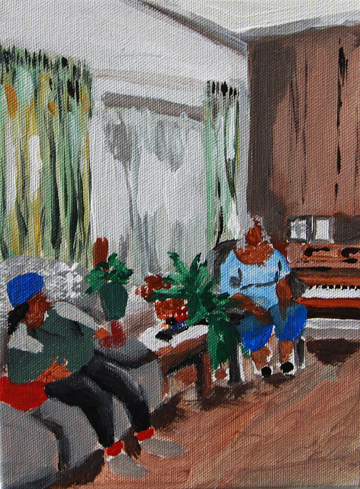 “Snap It Up” is a collection of paintings dedicated to my observations of my grandmother during her stages of Alzheimers. These works narrate recollections of my mother, aunt, and family interacting with my grandmother as caretakers and extensions of her maternal presence. The exhibition also underscores the tethering of black families to their maternal domestic spaces and how those domestic spaces are sacred against the tentacles of Neo-colonialism. The colors are palettes of primaries and earth tones. Neutral colors will be present in the documents supporting the context of hand-wrought work. My themes are discovery, faith, and black familial resiliency.